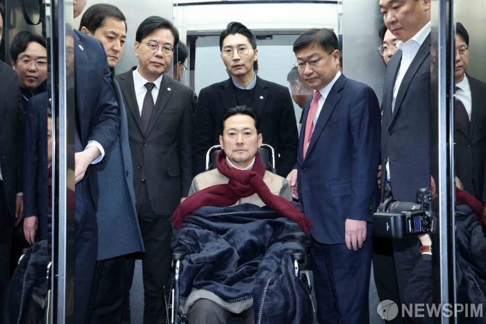 [서울=뉴스핌] 윤창빈 기자 = 통일교·공천헌금 '쌍특검'을 요구하며 8일째 단식을 진행 중인 장동혁 국민의힘 대표가 22일 서울 여의도 국회에서 단식을 중단하고 병원으로 이송되고 있다. 2026.01.22 pangbin@newspim.com