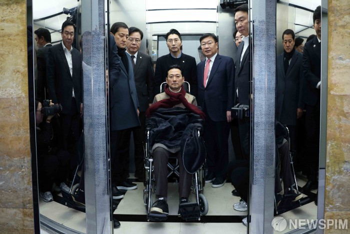 승강기 오른 장동혁 대표