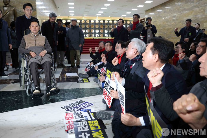 [서울=뉴스핌] 윤창빈 기자 = 통일교·공천헌금 '쌍특검'을 요구하며 8일째 단식을 진행 중인 장동혁 국민의힘 대표가 22일 서울 여의도 국회에서 단식을 중단하고 병원으로 이송되고 있다. 2026.01.22 pangbin@newspim.com