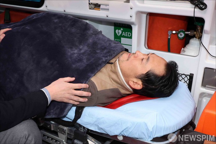 [서울=뉴스핌] 윤창빈 기자 = 통일교·공천헌금 '쌍특검'을 요구하며 8일째 단식을 진행 중인 장동혁 국민의힘 대표가 22일 서울 여의도 국회에서 단식을 중단하고 병원으로 이송되고 있다. 2026.01.22 pangbin@newspim.com