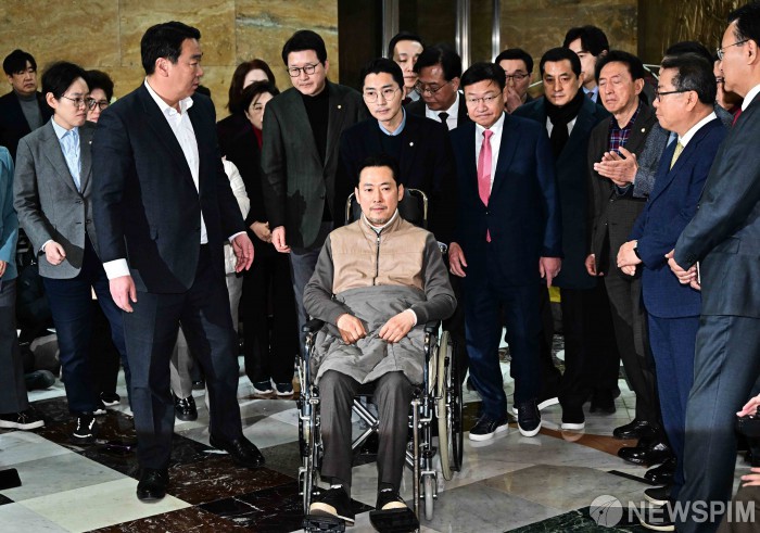 [서울=뉴스핌] 윤창빈 기자 = 통일교·공천헌금 '쌍특검'을 요구하며 8일째 단식을 진행 중인 장동혁 국민의힘 대표가 22일 서울 여의도 국회에서 단식을 중단하고 병원으로 이송되고 있다. 2026.01.22 pangbin@newspim.com