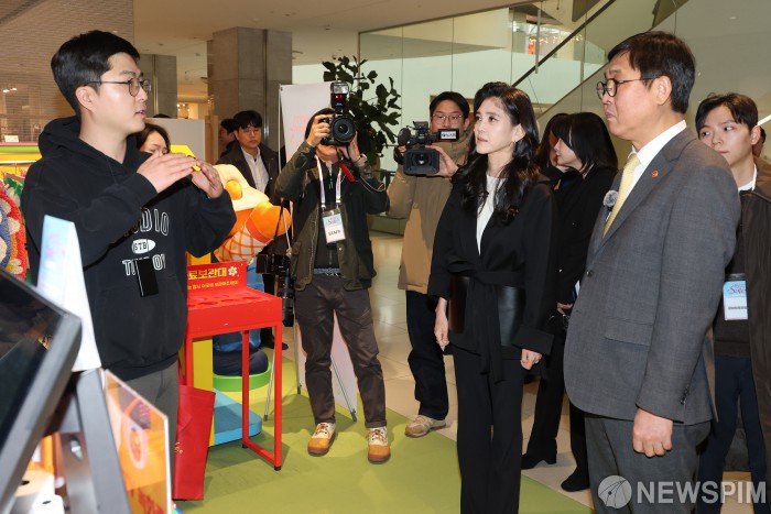 [서울=뉴스핌] 이형석 기자 = 최휘영 문화체육관광부 장관과 이부진 한국방문의해위원장이 22일 오후 서울 여의도 더현대 서울을 찾아 2026 코리아그랜드세일에 참여하는 매장 '위글위글'에서 관계자의 설명을 듣고 있다. 2026.01.22 leehs@newspim.com