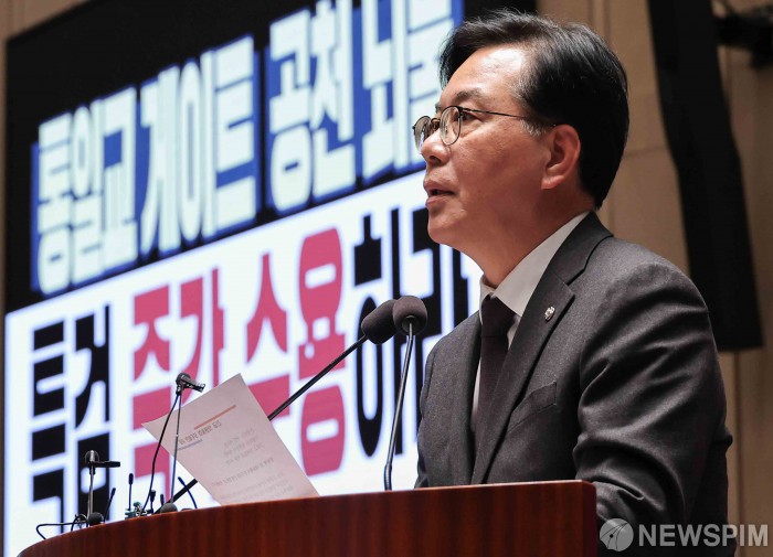 [서울=뉴스핌] 윤창빈 기자 = 송언석 국민의힘 원내대표가 22일 서울 여의도 국회에서 열린 긴급 의원총회에서 모두발언을 하고 있다. 2026.01.22 pangbin@newspim.com