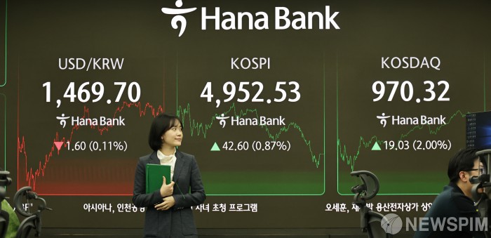 [서울=뉴스핌] 양윤모 기자 = 22일 오후 코스피가 전장 종가보다 42.60 포인트(0.87%) 상승하며 4952.53으로, 코스닥은 19.06 포인트(2.00%) 상승한 970.35로 장을 마감한 가운데, 서울 중구 하나은행본점 딜링룸에서 직원들이 업무를 보고 있다. 서울외환시장에서 달러/원 환율은 전장 대비 1.60원 하락한 1469.70원에 주간거래를 마감했다. 2026.01.22 yym58@newspim.com