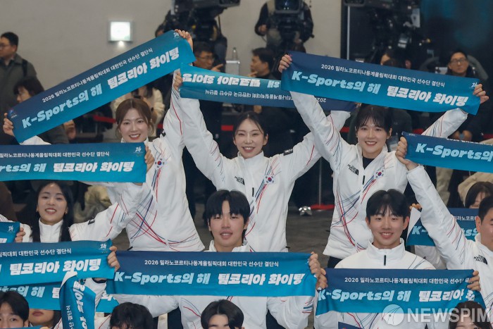 [서울=뉴스핌] 류기찬 기자 = 대한민국 선수단이 22일 오후 서울 송파구 올림픽파크텔에서 열린 ‘2026 밀라노 동계올림픽 선수단 결단식’에서 기념촬영을 하고 있다. 2026.01.22 ryuchan0925@newspim.com