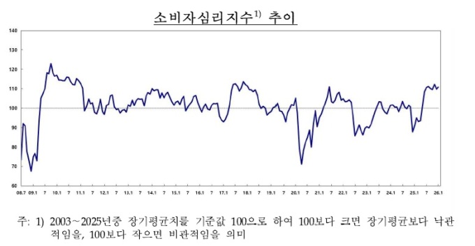 한국은행이 23일 발표한 '2026년 1월 소비자동향조사' 결과에 따르면 소비자심리지수(CCSI)는 110.8로 전월보다 1.0포인트(p) 상승했다. 소비자심리지수는 장기평균 기준값을 100으로, 100보다 크면 장기평균보다 낙관적임을, 100보다 작으면 비관적임을 의미한다. 조사 기간은 지난 8일부터 15일까지다.