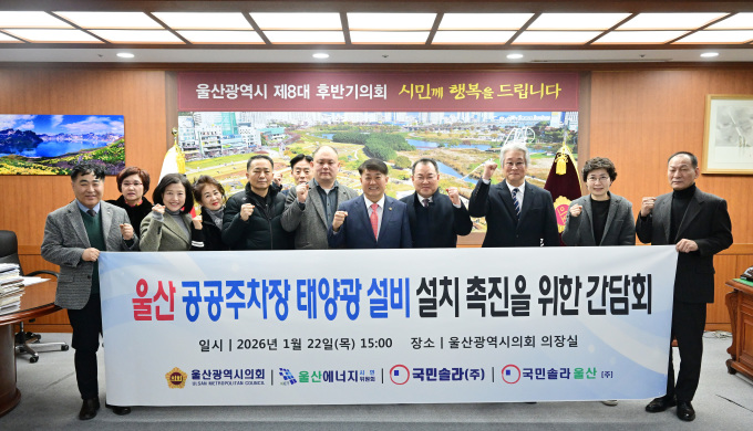 울산시의회는 22일 '에너지특구 울산·AI 수도 울산' 비전 실현의 일환으로 '공공주차장 태양광 설치 촉진을 위한 간담회'를 열고 울산형 시민주도 방식의 재생에너지 추진안을 제안했다.