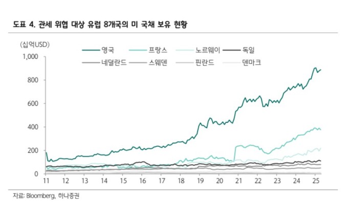 실제 숫자로 보면 위협의 강도가 더욱 선명해진다. 2025년 12월 기준 해외 투자자의 미 국채 보유 비중은 전체 발행 잔액의 30% 수준이다. 특히 이번 관세 위협 대상이었던 유럽 8개국(영국, 프랑스, 노르웨이, 독일, 네덜란드, 스웨덴, 핀란드, 덴마크)의 미 국채 보유 규모는 약 1조7000억 달러로, 전체 해외 보유분의 19%이자 전체 미 국채 발행 잔액의 6%를 차지한다. 8개국 합산 규모는 최대 보유국인 일본보다 크다.
