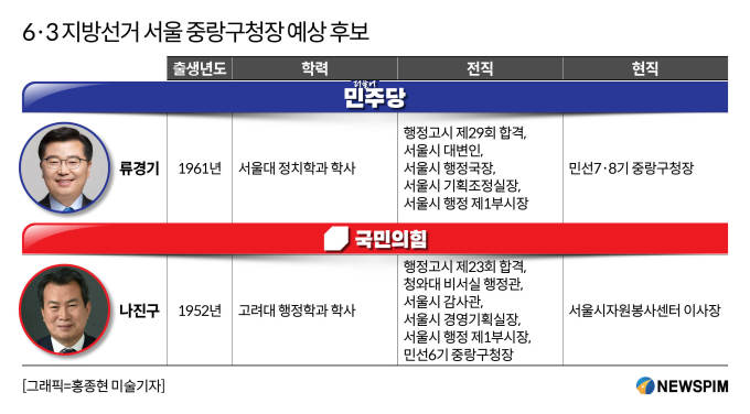 [서울=뉴스핌] 이경화 기자 = 6·3 지방선거를 앞두고 서울 중랑구에서는 더불어민주당 소속 류경기 현 구청장과 국민의힘 소속 나진구 전 구청장이 다시 한 번 격돌할지 주목된다.
