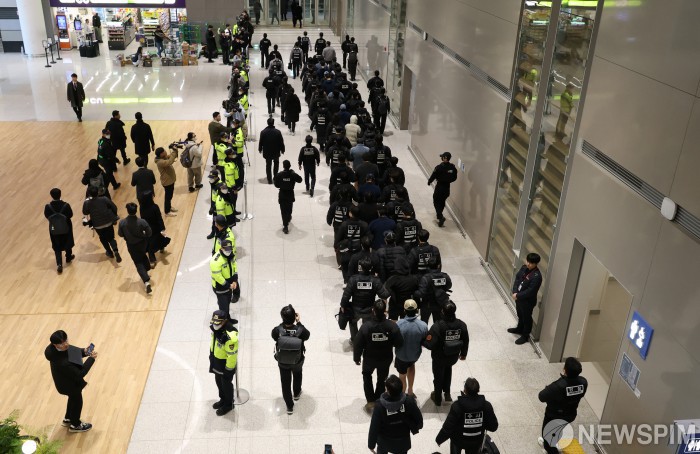 [영종도=뉴스핌] 정일구 기자 = 딥페이크 기술을 이용해 120억원을 가로챈 '로맨스 스캠 부부사기단' 등 캄보디아에서 각종 범행을 저지른 한국인 범죄 피의자 73명이 23일 오전 인천국제공항 제2여객터미널을 통해 송환되고 있다. 2026.01.23 mironj19@newspim.com
