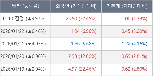 [서울=뉴스핌] 로보뉴스 = 23일 11시 30분 현재 플리토(300080)는 외국인과 기관이 각각 23.50 만 주, 1.00 만 주 순매수(잠정) 하면서 전일 대비 9.97% (현재가 16,990원) 상승하고 있다.