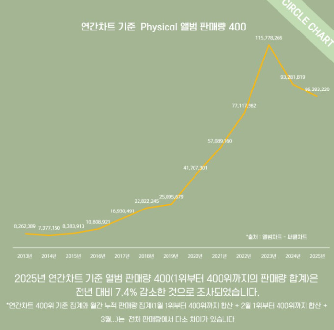 [서울=뉴스핌] 이지은 기자 = 지난해 연간차트 기준 앨범 판매량 400은 전년 대비 7.4% 감소했다. [사진=써클차트] 2026.01.23 alice09@newspim.com