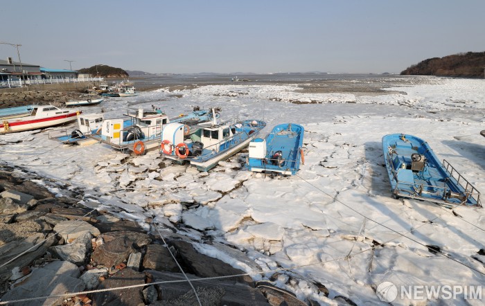 [인천=뉴스핌] 정일구 기자 = 연일 한파가 이어지고 있는 23일 오후 인천 중구 예단포항에 정박한 어선들이 꽁꽁 얼어붙은 포구에 갇혀 있다. 2026.01.23 mironj19@newspim.com