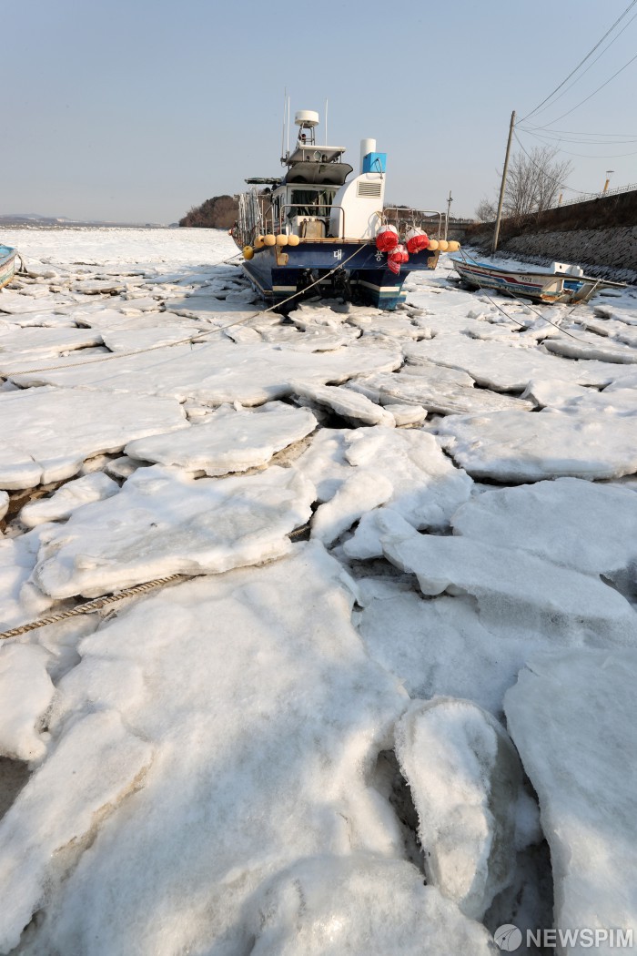 [인천=뉴스핌] 정일구 기자 = 연일 한파가 이어지고 있는 23일 오후 인천 중구 예단포항에 정박한 어선들이 꽁꽁 얼어붙은 포구에 갇혀 있다. 2026.01.23 mironj19@newspim.com