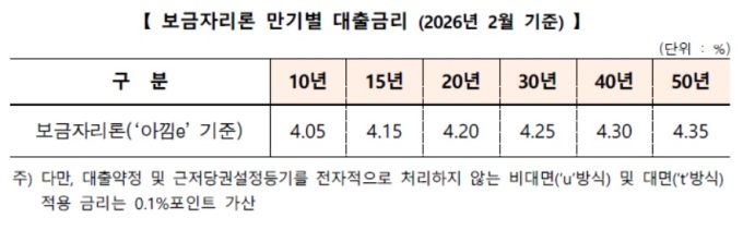이에 따라 '아낌e-보금자리론' 기준으로 연 4.05(10년)~4.35%(50년)가 적용되며 저소득청년, 신혼가구, 사회적배려층(장애인·한부모 가정 등) 및 전세사기피해자 등에게는 우대금리(최대 1.0%p)를 적용해 최저 연 3.05(10년)~3.35%(50년) 금리가 적용된다.