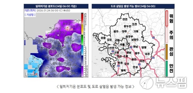 [수원=뉴스핌] 박승봉 기자 = 24일 경기도 전역에 영하 15도 안팎의 강력한 '북극 한파'가 몰아친 가운데, 밤사이 내린 폭설까지 얼어붙으며 도내 곳곳에서 빙판길 사고와 동파 피해가 잇따르고 있다. 경기도는 비상 1단계를 가동하고 재난안전대책본부를 중심으로 긴급 대응에 나섰다.