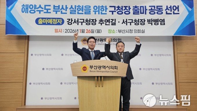 [부산=뉴스핌] 남동현 기자 = 더불어민주당 소속 추연길 전 부산시설공단이사장(왼쪽)과 박병염 민주평화통일자문회의 부산 서구 협의회장이 26일 오전 10시 부산시의회 3층 브리핑룸에서 강서·서구청장에 출마를 선언하며 해양수도 부산을 실현할 것을 다짐하고 있다. 2026.01.26