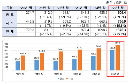 26일 금융투자협회가 발표한 '2025 펀드시장 결산'에 따르면 2025년 말 기준 전체 펀드(공·사모) 순자산총액은 1376조3000억원으로, 전년 말(1098조7000억원) 대비 277조6000억원(25.3%) 증가했다. 이는 2007년 이후 가장 높은 연간 성장률이다.