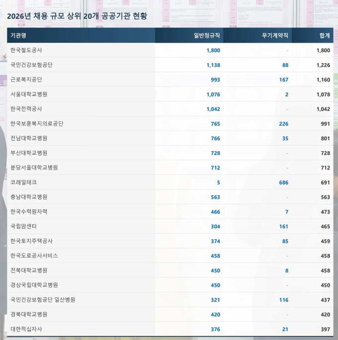 채용 규모가 1000명 이상인 기관으로는 ▲한국철도공사(1800명) ▲국민건강보험공단(1226명) ▲근로복지공단(1160명) ▲서울대학교병원(1078명) ▲한국전력공사(1042명) 등이 포함됐다. 이들 기관은 박람회를 통해 기관별 채용 설명과 상담을 진행한다.