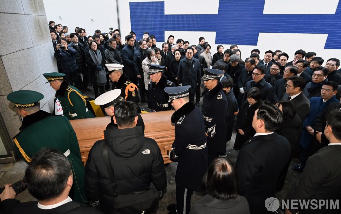 [서울=뉴스핌] 정일구 기자 = 베트남 출장 중 별세한 고(故) 이해찬 민주평화통일자문회의 수석부의장의 시신이 27일 오전 서울 종로구 서울대병원 장례식장으로 운구되고 있다. 2026.01.27 mironj19@newspim.com