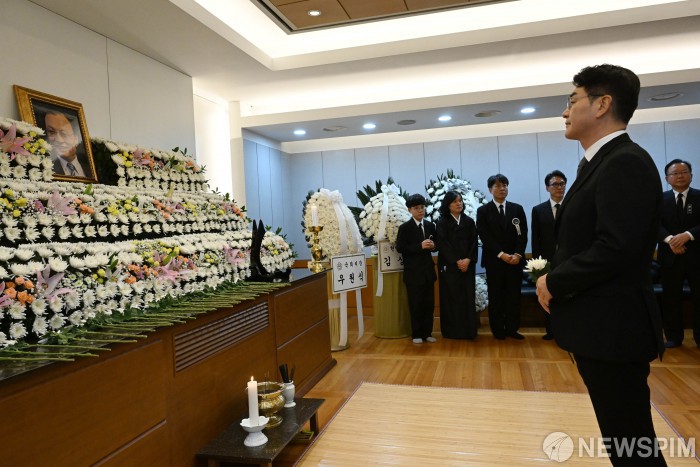 [서울=뉴스핌] 사진공동취재단 = 박용진 전 더불어민주당 의원이 27일 서울 종로구 서울대학교병원 장례식장에 마련된 이해찬 민주평화통일자문회의 수석부의장의 빈소에서 헌화하고 있다. 2026.01.27 photo@newspim.com