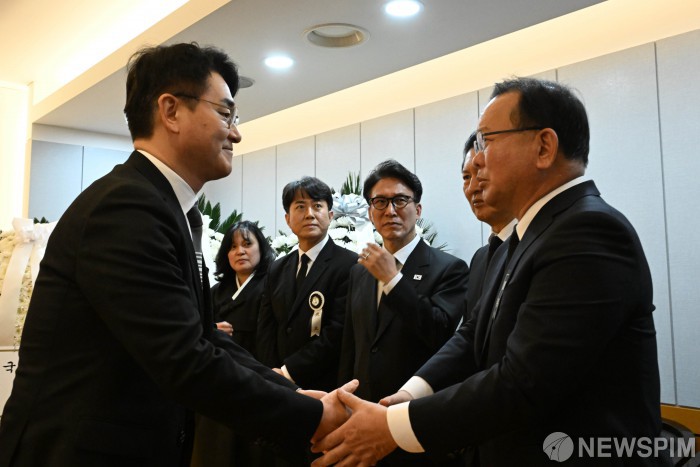 [서울=뉴스핌] 사진공동취재단 = 박용진 전 더불어민주당 의원이 27일 서울 종로구 서울대학교병원 장례식장에 마련된 이해찬 민주평화통일자문회의 수석부의장의 빈소에서 김부겸 전 국무총리와 인사를 나누고 있다. 2026.01.27 photo@newspim.com