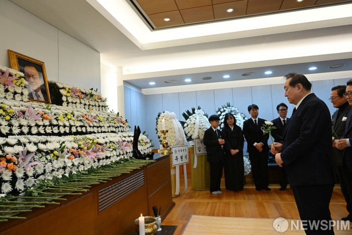 [서울=뉴스핌] 사진공동취재단 = 정대철 대한민국헌정회장이 27일 서울 종로구 서울대학교병원 장례식장에 마련된 이해찬 민주평화통일자문회의 수석부의장의 빈소에서 헌화하고 있다. 2026.01.27 photo@newspim.com