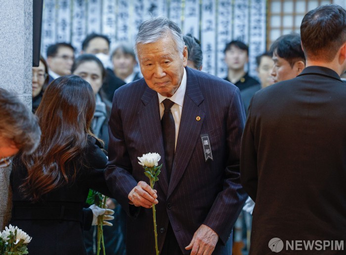 [서울=뉴스핌] 사진공동취재단 = 27일 서울 종로구 서울대학교병원 장례식장에 이해찬 민주평화통일자문회의 수석부의장의 빈소가 마련된 가운데 이중근 부영그룹 회장이 조문을 하고 있다. 2026.01.27 photo@newspim.com