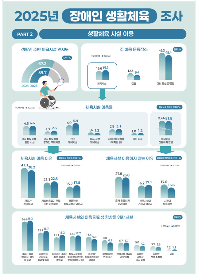 또 향후 생활권 주변에서 이용하고 싶은 체육시설로는 공공 체육시설 가운데 장애인·비장애인이 함께 쓰는 통합 시설 응답이 33.7%로 가장 높았으며, 이는 전년 대비 4.9%포인트 상승한 수치로 보고됐다.