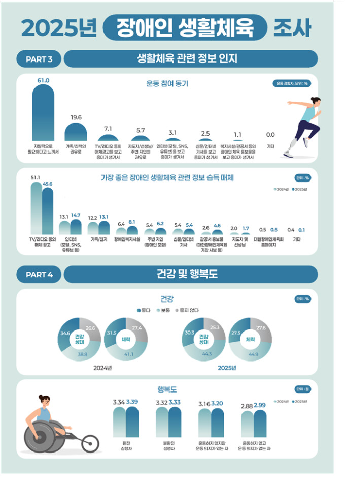 [서울=뉴스핌] 김용석 선임기자 = 문체부·대한장애인체육회가 전국 등록장애인 1만 명(10세~69세)을 대상으로 28일 발표한 '2025년 장애인 생활체육조사' 결과, 주 2회 이상 집 밖에서 운동하는 '완전 실행자' 비율은 34.8%로 전년보다 0.4%포인트 낮아진 반면, 참여도가 높을수록 행복감 지수는 뚜렷하게 높게 나타났다.