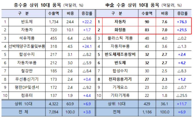 다만 기타기계류는 21억6000만달러로 25.5% 감소해 상위 10대 품목 중 가장 큰 감소폭을 기록했다. 합성수지(-8.3%)와 자동차부품(-1.3%) 등 일부 중간재 품목도 부진한 실적을 냈다.