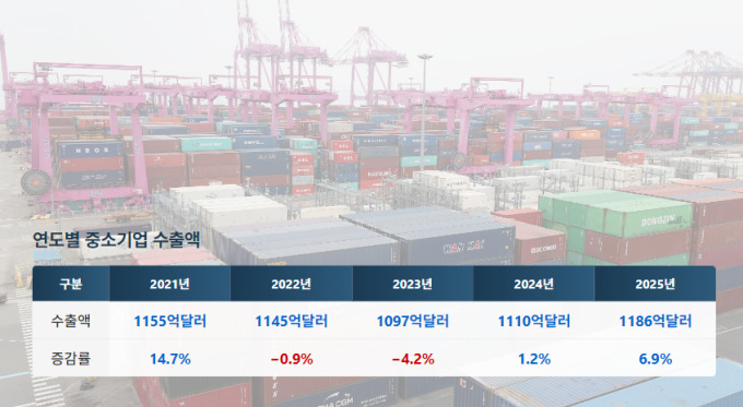 [세종=뉴스핌] 김기랑 기자 = 지난해 중소기업 수출이 글로벌 보호무역 기조와 관세 리스크 속에서도 1186억달러(약 1700조원)를 기록하며 역대 최대치를 갈아치웠다. 이는 전년 대비 6.9% 증가한 수치로, 최근 몇 년간의 부진을 딛고 뚜렷한 회복 흐름을 보였다.