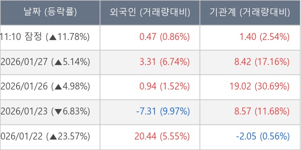 [서울=뉴스핌] 로보뉴스 = 28일 11시 30분 현재 에프에스티(036810)는 외국인과 기관이 각각 0.47 만 주, 1.40 만 주 순매수(잠정) 하면서 전일 대비 11.78% (현재가 44,600원) 상승하고 있다.