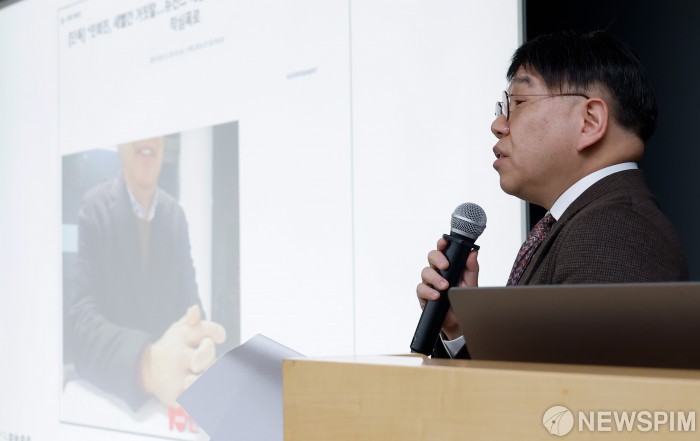 [서울=뉴스핌] 류기찬 기자 = 민희진 전 어도어 대표 측 법률대리인 법무법인 지암 김선웅 변호사가 28일 오후 서울 종로구 교원스페이스 챌린지홀에서 열린 ‘뉴진스 탬퍼링’ 의혹에 관한 기자회견에서 발언을 하고 있다. 2026.01.28 ryuchan0925@newspim.com