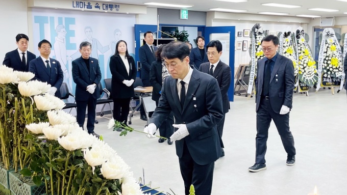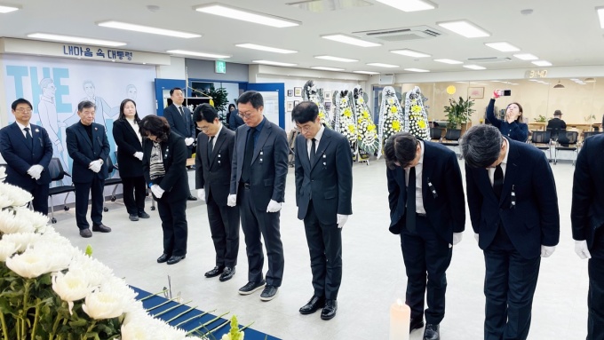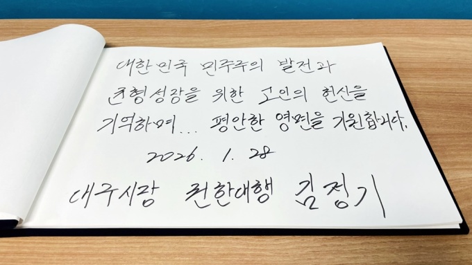[대구=뉴스핌] 남효선 기자 = 김정기 대구시장 권한대행을 비롯 정의관 미래혁신성장실장, 한종곤 행정국장 등 대구시 공무원들이 28일 대구시 중구 삼덕동 더불어민주당 대구시당에 마련된 고(故) 이해찬 전 국무총리 분향소를 찾아 고인의 업적을 기리고 있다. 민주당 대구시당은 지난 27일 대구시당에 고 이해찬 전 국무총리 분향소를 설치하고 사회장(社會葬)이 마무리되는 오는 31일까지 운영한다. '1세대 민주화 운동권' 출신으로 민주당 내 '킹메이커'로 불렸던 이 전 총리는 베트남 출장 중이던 지난 23일 심근경색으로 쓰러져 현지 병원에서 치료받았지만, 의식을 회복하지 못하고 25일, 74세의 일기로 영면에 들어갔다. 고 이해찬 전 국무총리의 장례식은 사회장으로 치러지며 정부는 고인에게 국민훈장 무궁화장을 추서했다.[사진=민주당 대구시당] 2026.1.28.