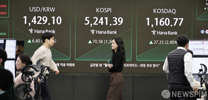 [서울=뉴스핌] 양윤모 기자 = 美연준이 금리를 3연속 인하 후 동결한 29일 오전 코스피가 전장 종가보다 70.58 포인트(1.30%) 상승하며 5241.39로, 코스닥은 27.25 포인트(2.40%) 상승한 1160.77로 장을 시작한 가운데, 서울 중구 하나은행본점 딜링룸에서 직원들이 업무를 보고 있다. 서울외환시장에서 달러/원 환율은 전장 대비 6.60원 상승한 1429.10원에 주간거래를 시작했다. 2026.01.29 yym58@newspim.com