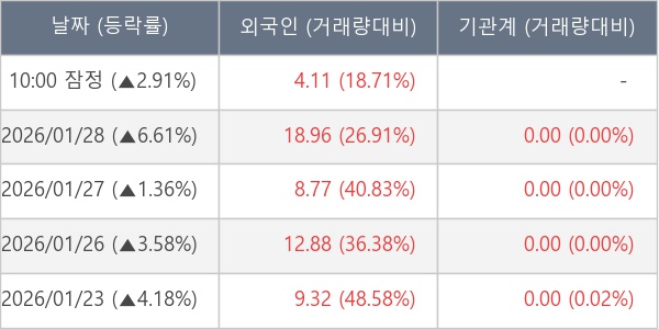 [서울=뉴스핌] 로보뉴스 = 29일 10시 15분 현재 박셀바이오(323990)는 전일 대비 2.91% (현재가 10,620원) 상승했고, 외국인이 최근 5일 연속 순매수(누적 54.04만 주, 잠정) 행진을 하고 있다.