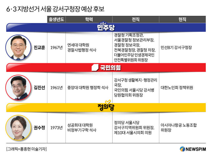 현 구청장에 맞서 국민의힘에서는 김진선 전 강서구병 당협위원장, 정의당에서는 권수정 전 서울시의회 의원이 출마를 고려하고 있다.
