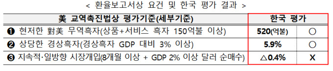 한국은 ▲대미 상품·서비스 무역흑자 150억달러 이상 ▲국내총생산(GDP) 대비 경상흑자 3% 이상 등 3개 요건 가운데 2개를 충족했다. 한국의 대미 무역흑자는 520억달러, 경상수지는 GDP 대비 5.9%로 집계됐다.