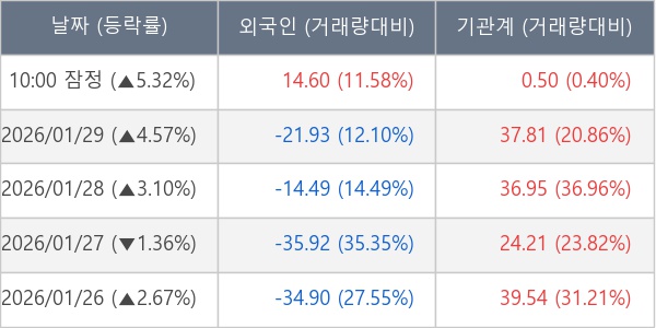 [서울=뉴스핌] 로보뉴스 = 30일 10시 15분 현재 원텍(336570)은 전일 대비 5.32% (현재가 9,890원) 상승했고, 기관이 최근 6일 연속 순매수(누적 160.91만 주, 잠정) 행진을 하고 있다.