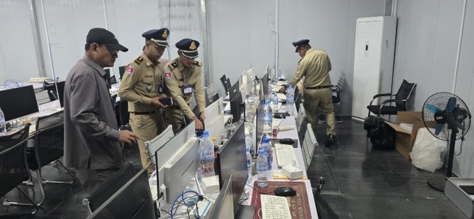캄보디아 거점 로맨스스캠 범죄조직 사무실을 조사하는 현지 경찰들 모습. [사진=충남경찰청] 2026.01.30 jongwon3454@newspim.com