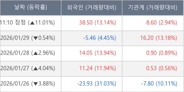 [서울=뉴스핌] 로보뉴스 = 30일 11시 30분 현재 한화비전(489790)은 외국인과 기관이 각각 38.50 만 주, 8.60 만 주 순매수(잠정) 하면서 전일 대비 11.01% (현재가 61,500원) 상승하고 있다.