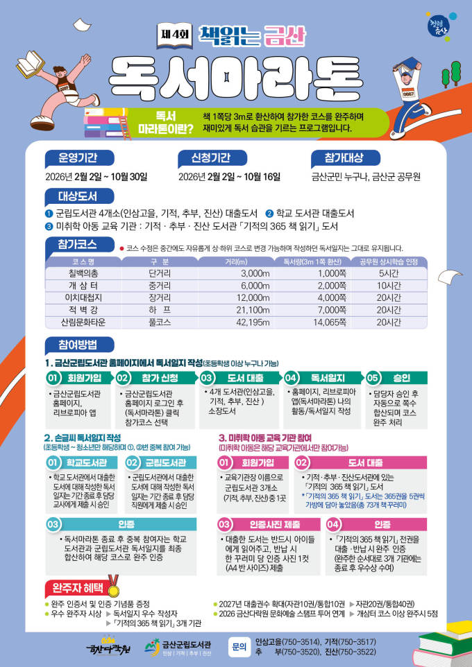 금산군립도서관 회원이라면 누구나 참여할 수 있으며 완주자는 완주 인증서, 대출 권수 확대, 인증 기념품 등 혜택을 받을 수 있으며 우수 완주자 시상, 금산다락원 문화예술 스탬프 투어 연계 기회도 제공된다.