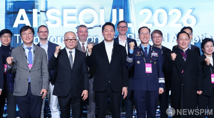 [서울=뉴스핌] 정일구 기자 = 오세훈 서울시장이 30일 오전 서울 강남구 코엑스에서 열린 AI SEOUL 2026에서 참석자들과 기념촬영을 하고 있다. 2026.01.30 mironj19@newspim.com