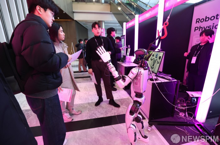 [서울=뉴스핌] 정일구 기자 = 30일 오전 서울 강남구 코엑스에서 열린 AI SEOUL 2026 기업부스에서 관계자가 실시간 모션케어 기반 로봇 원격제어 시연을 하고 있다. 2026.01.30 mironj19@newspim.com