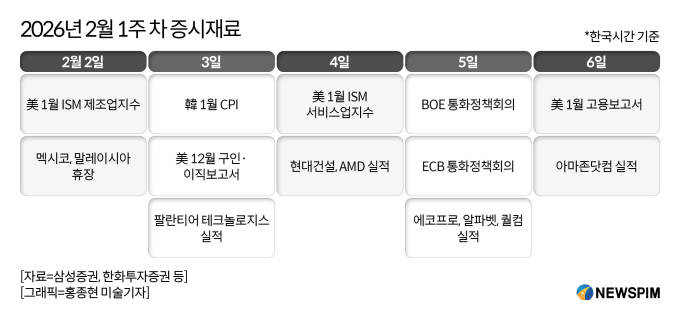 한편 이번 주에는 미국 기술주의 실적 발표도 이어진다. AI 소프트웨어 대장주로 꼽히는 팔란티어 테크놀로지스를 시작으로 AMD, 알파벳, 퀄컴, 아마존닷컴의 실적이 예정돼 있다. 국내에서도 설 연휴 전까지 2차전지, 조선·방산, 금융, 제약, 유통 등 주요 기업의 실적 발표가 마무리될 전망이다.