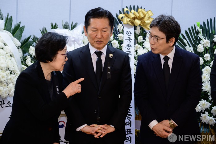 [서울=뉴스핌] 사진공동취재단 = 한명숙 전 국무총리(왼쪽부터), 정청래 더불어민주당 대표, 유시민 작가가 30일 오후 서울 종로구 서울대학교병원 장례식장에 마련된 고(故) 이해찬 전 국무총리의 빈소에서 대화를 나누고 있다. 2026.01.30 photo@newspim.com