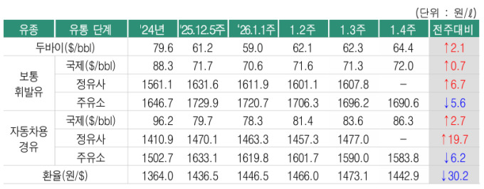 지난주(1월 3주) 정유사 휘발유 공급가격은 전주보다 6.7원 상승한 리터당 1607.8원, 경유 공급가격은 19.7원 상승한 리터당 1477.0원으로 집계됐다.