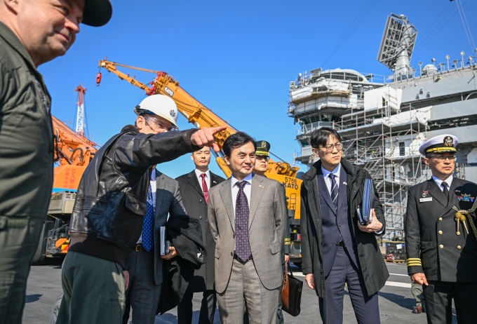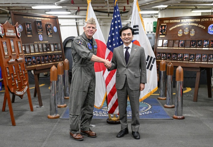 안 장관은 이날 오전 10시30분부터 약 1시간 동안 요코스카에 정박 중인 미 해군 항모 CVN-73 '조지워싱턴함'을 방문해 패트릭 해니핀 제7함대 사령관을 만났다. 그는 "확고한 한미동맹과 연합작전태세가 역내 안보의 핵심축"이라며 긴밀한 협력을 당부했고, 해니핀 사령관은 "연합작전 능력 향상을 위해 지속 노력하겠다"고 화답했다.