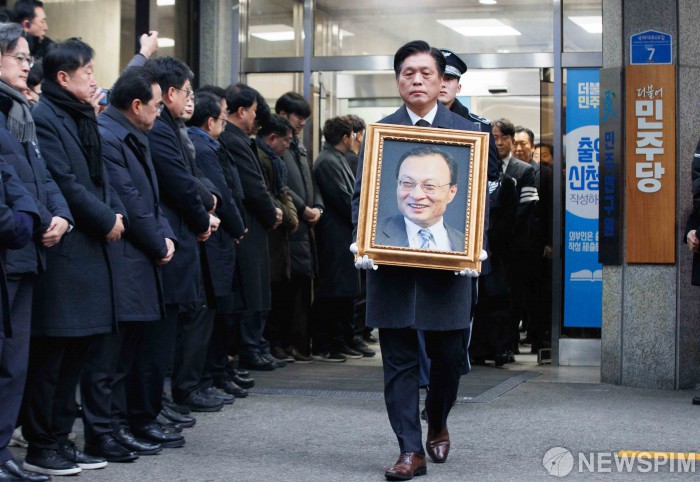 [서울=뉴스핌] 윤창빈 기자 = 31일 오전 서울 여의도 더불어민주당 중앙당사에서 엄수된 고(故) 이해찬 민주평화통일자문회의 수석부의장 노제에서 조승래 더불어민주당 사무총장이 영정을 들고 당사에서 나오고 있다. 2026.01.31 pangbin@newspim.com